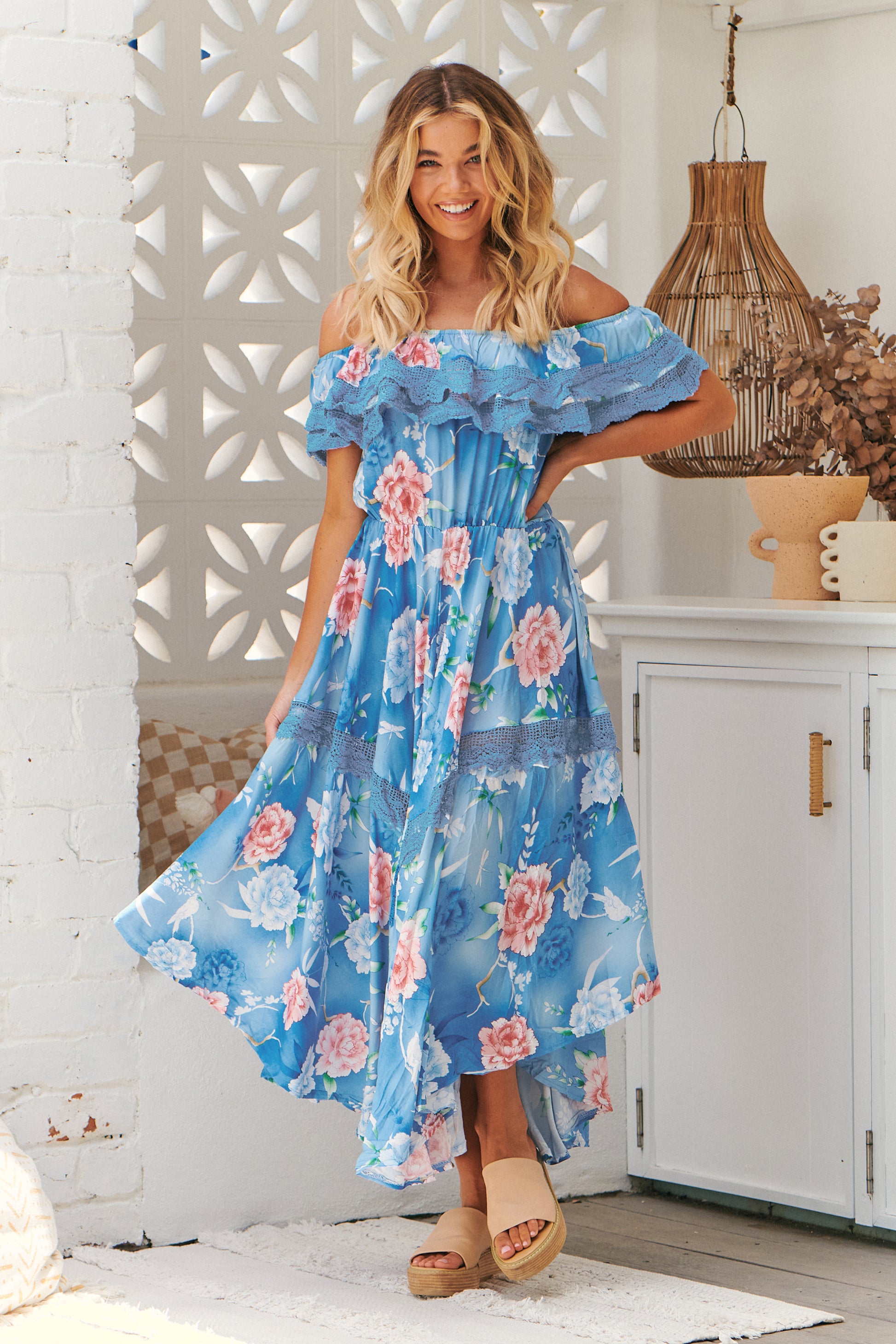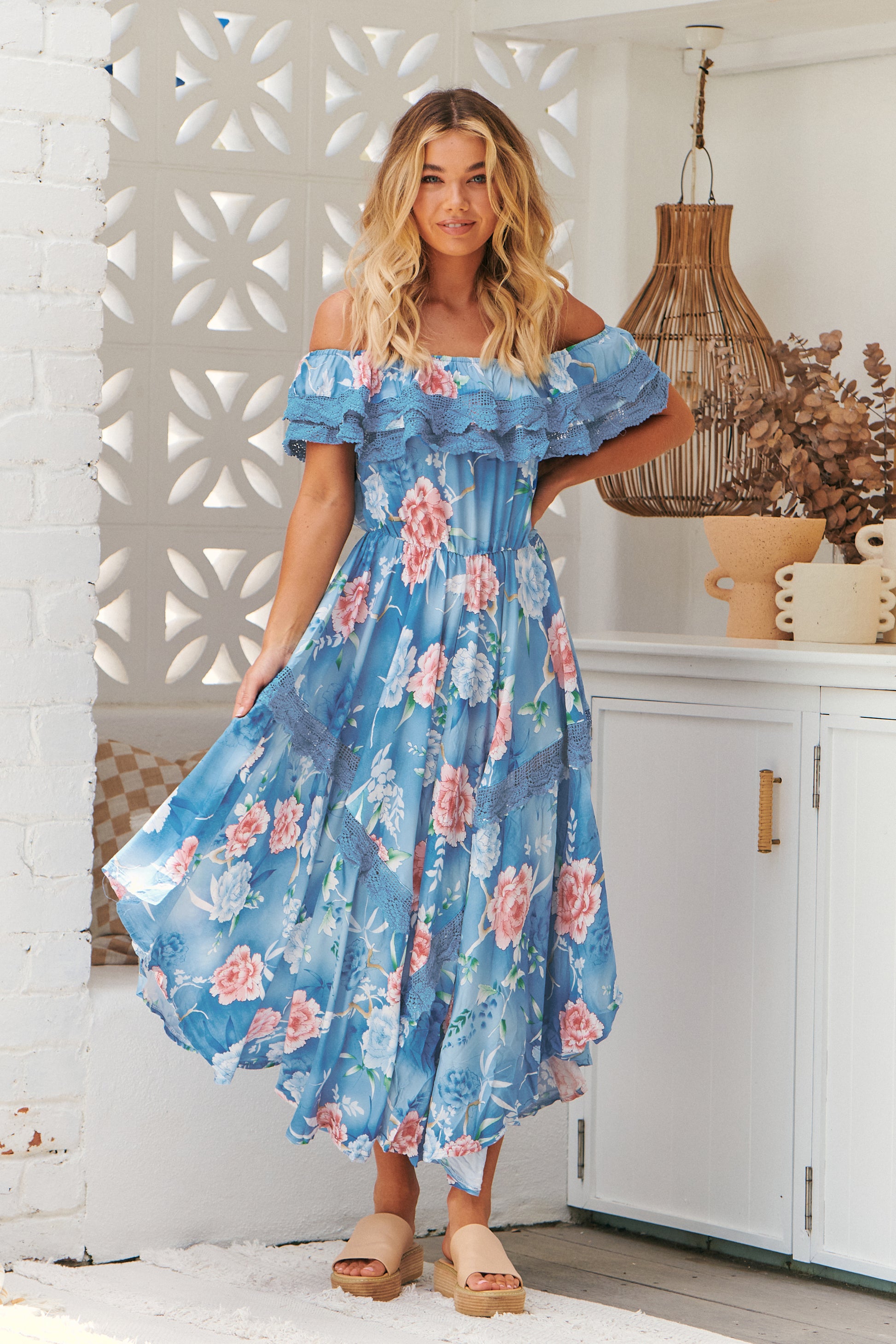 This divine boho off the shoulder Ana Santorina Positano dress is sure to WOW. With stretch elastic neckline, ruffle lace detailing, elastic waist, asymmetrical full body style skirt that flows with maximum material to give the full gypsy effect.