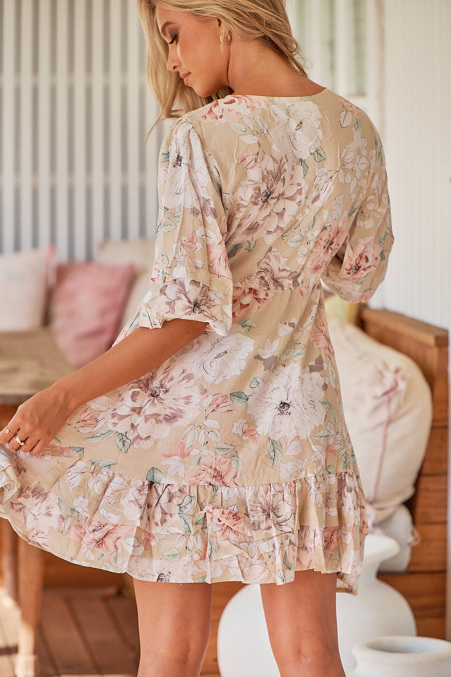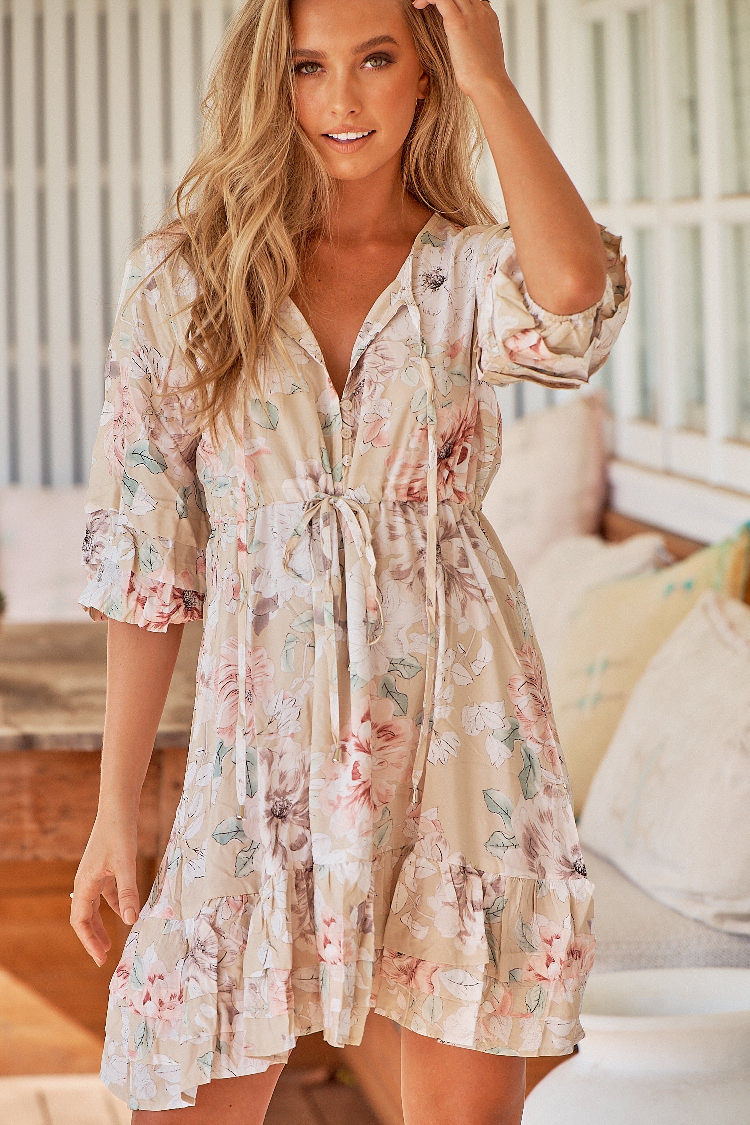 Beautiful short dress in sand colours, the Illana Faith dress will make a great addiction to your wardrobe.