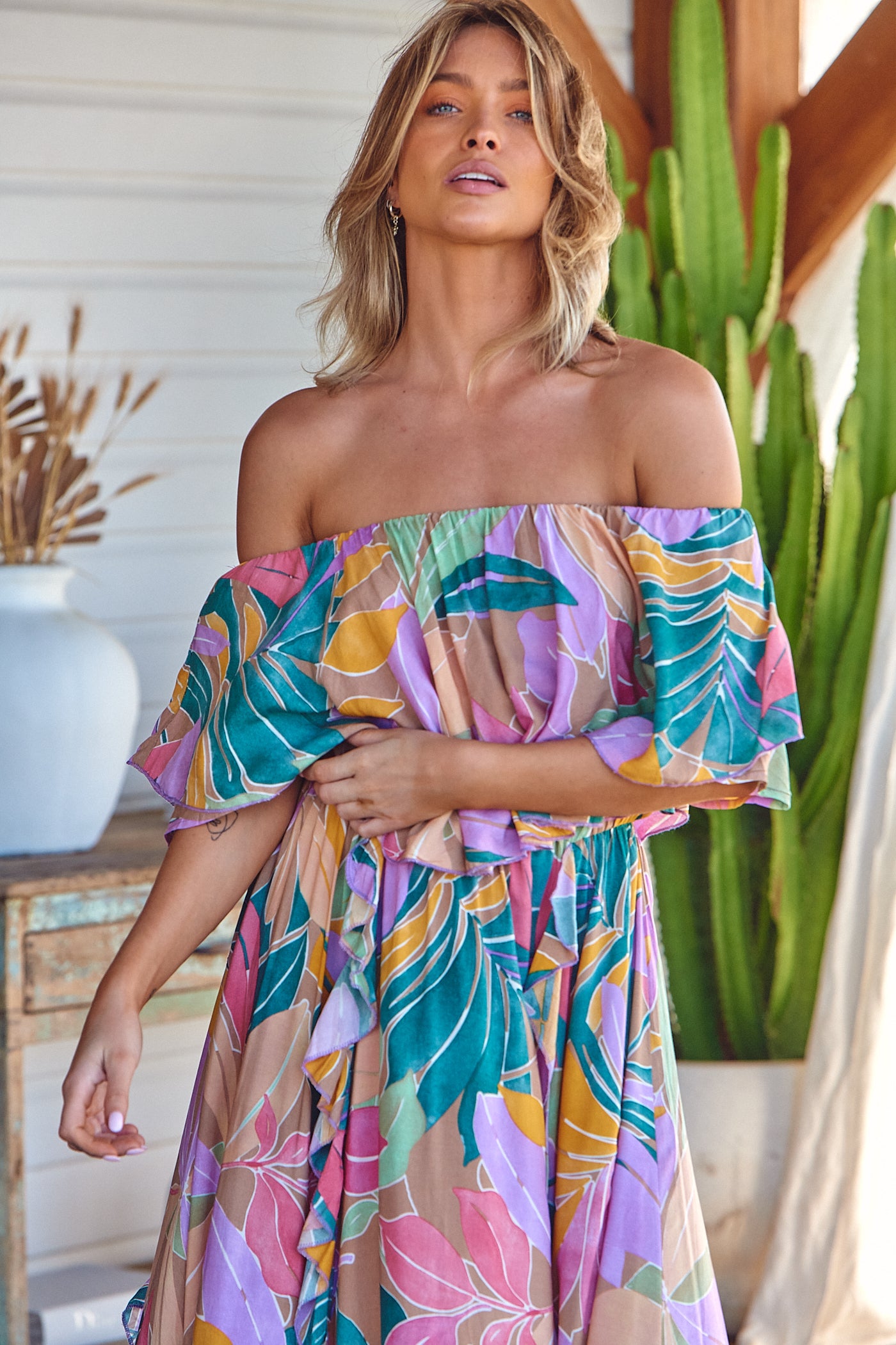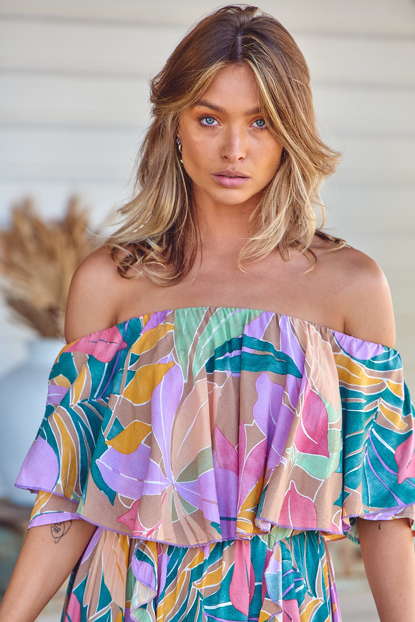 - KEY FEATURES: Off the Shoulder, Frill Overlay Bodice, Elasticated Waistband and Frill Detailing.