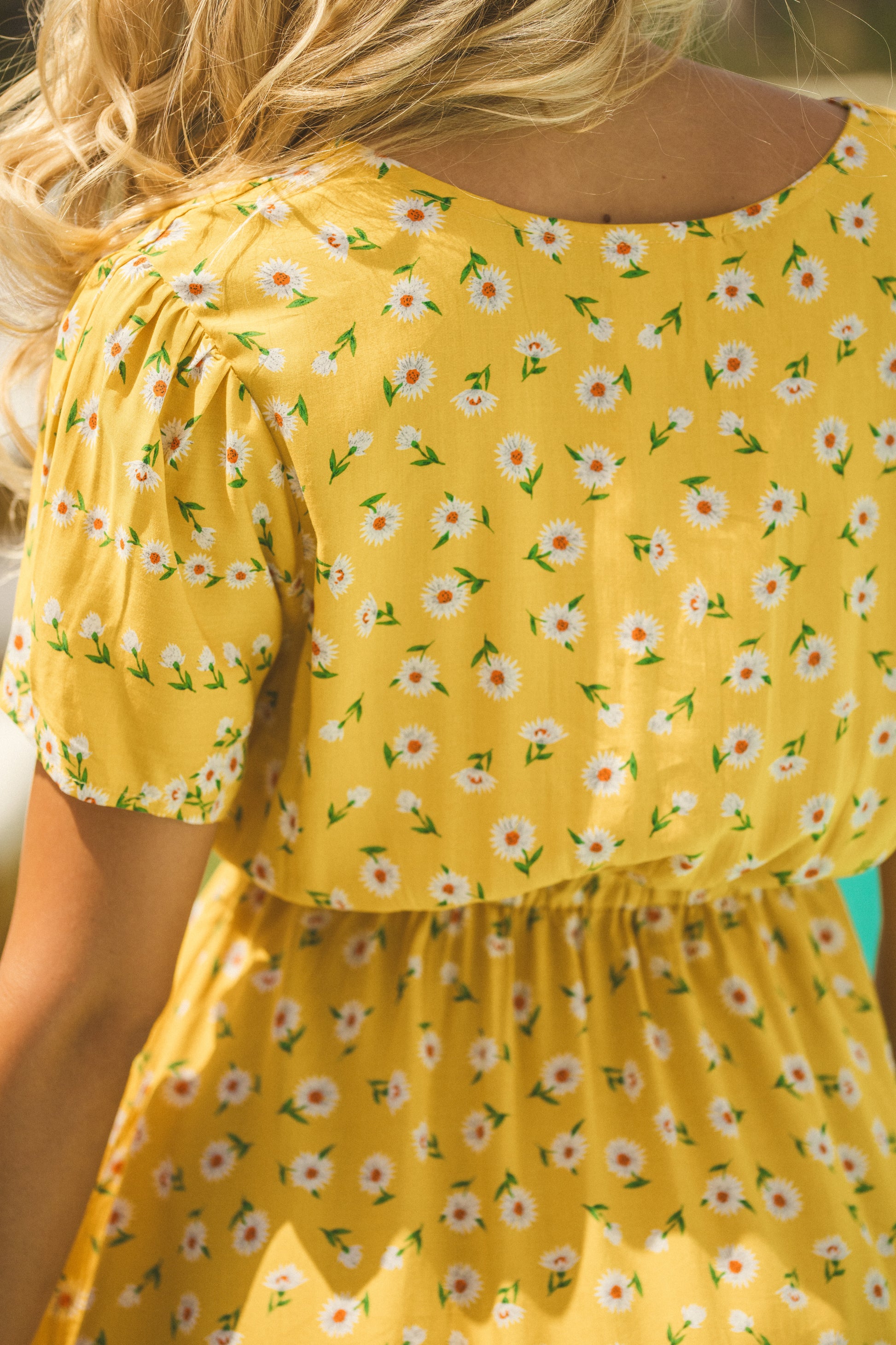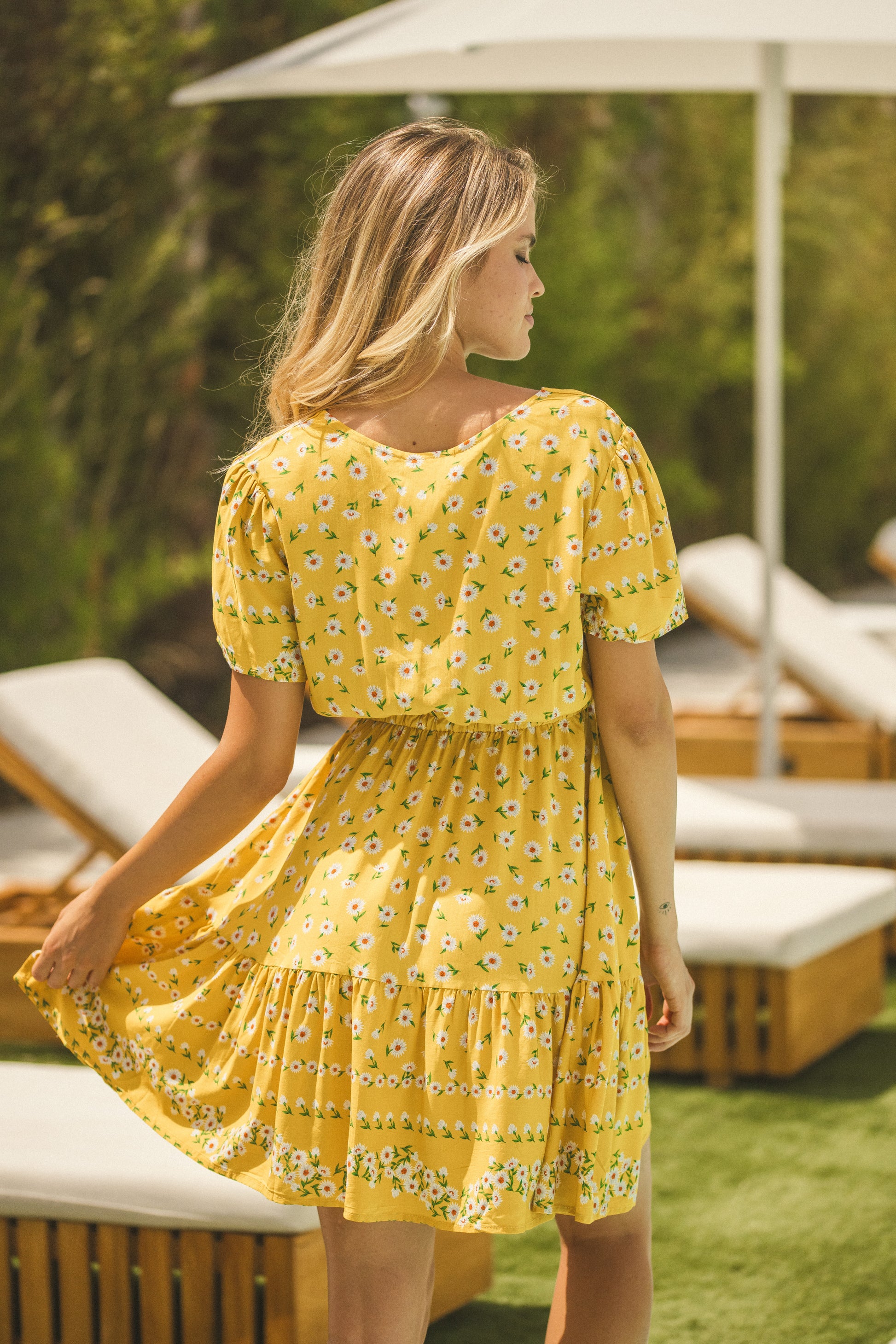 Add a pop of color to your wardrobe with the Mellow Margarita Lolana! This playful dress features a vibrant yellow hue and a flattering V neckline. The short sleeves and drawstring waist add a touch of fun and versatility. Made from 100% rayon, it's lightweight and perfect for any occasion. Cheers to style and comfort!