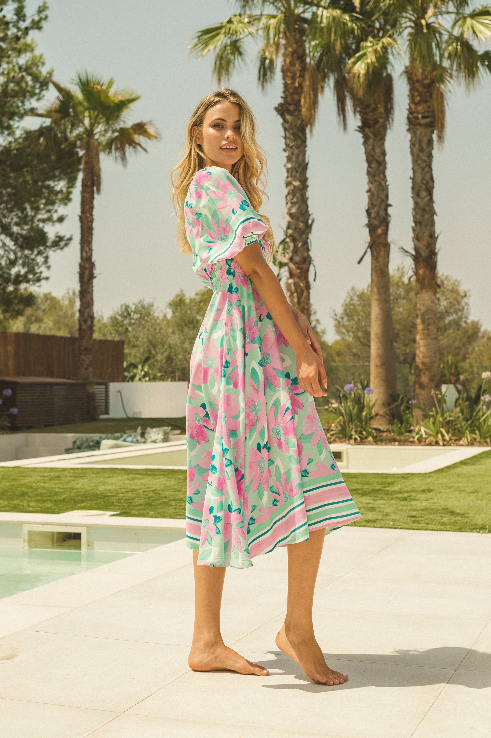 Slip into playful elegance with the Petal Aqua Dress! The shirred bodice waist cinches for a flattering fit while tassel details add a touch of whimsy. With elastic cuffs for comfort, this dress is perfect for any occasion. (No frumpy dresses here!)